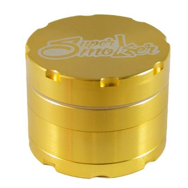 Grinder Super Smoker de aluminio de alta calidad, consta de 4 partes: Malla fijada con arandela metálica, moledora, depósito y tapa con imán.