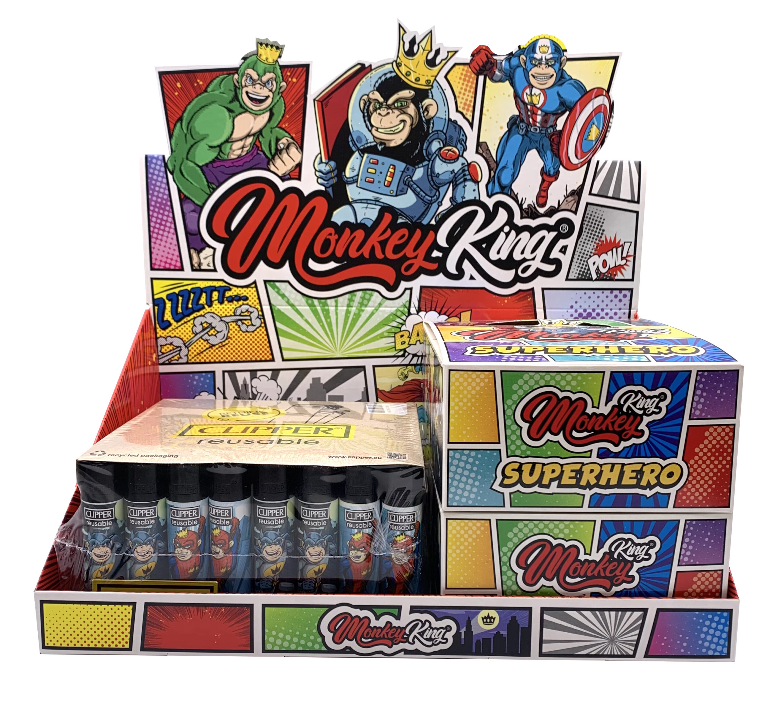El nuevo pack de la edición Super Hero une lo mejor de ambas marcas. Monkey King nos trae el nuevo Pack Clipper Monkey Hero, que contiene un librillo king size con 32 hojas de papel marrón, sin blanquear ni aditivos, ultra fino, de combustión lenta y uniforme. Sus 16 filtros dobles correspondientes, de cartón troquelados, para facilitar su uso y mejorar su filtrado. Y un mechero Clipper con un diseño único, todo inspirado en la gama Super Hero, a juego con el librillo de papel y filtros.