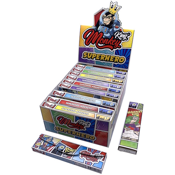 El nuevo Pack Monkey King Super Hero cuenta con un librillo de papel king size marrón, sin blanquear, hecho con fibras vegetales, sin colorantes ni aditivos y con goma arábiga 100% natural, un papel ultra fino que proporciona una combustión lenta y uniforme. Y con su respectivos 16 filtros dobles de cartón de 51 mm X 25 mm, de 140 gramos, troquelados que facilitan su uso y mejoran el filtrado. Lo que lo convierte un pack perfecto con todo lo necesario.